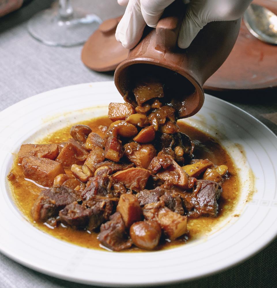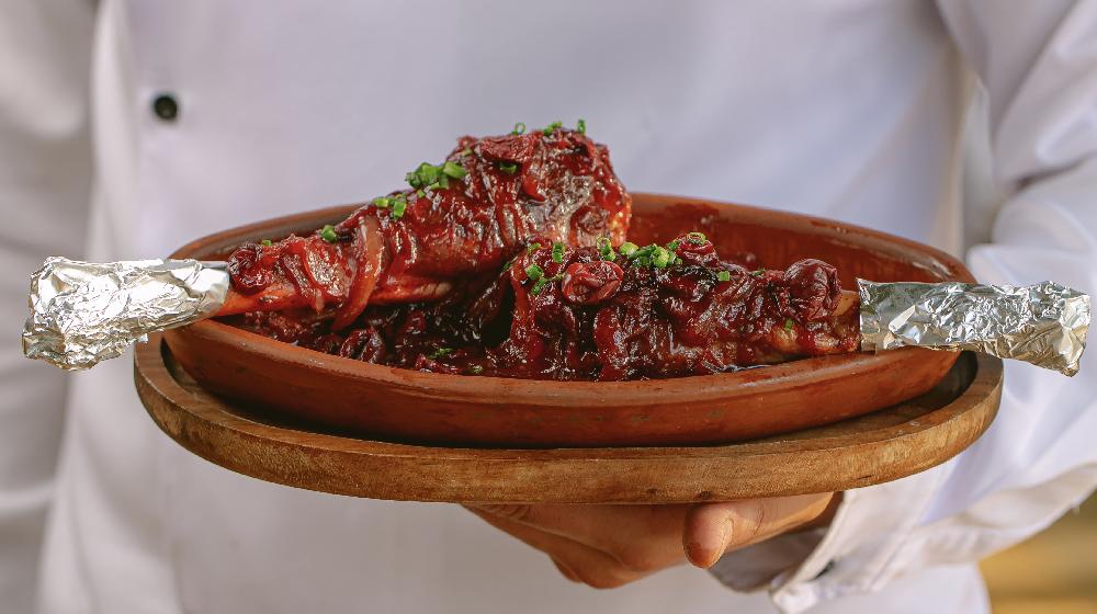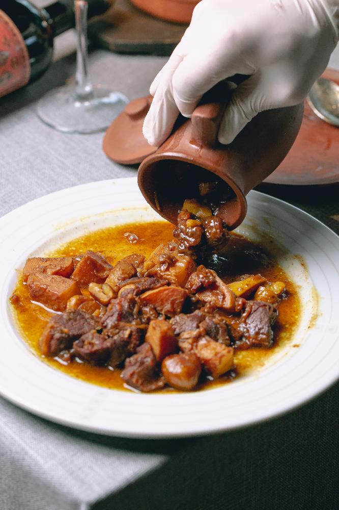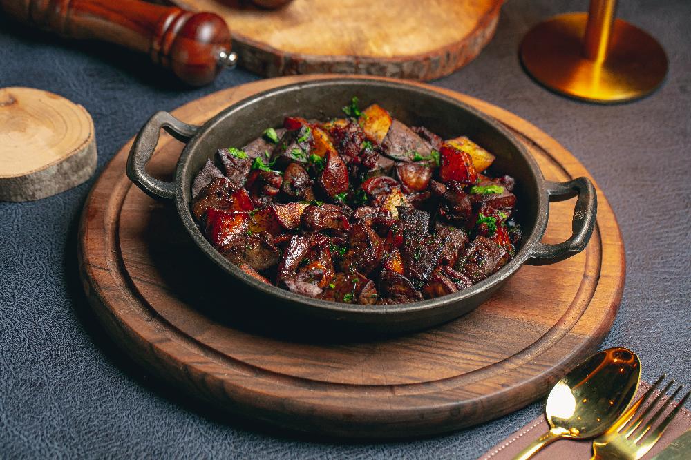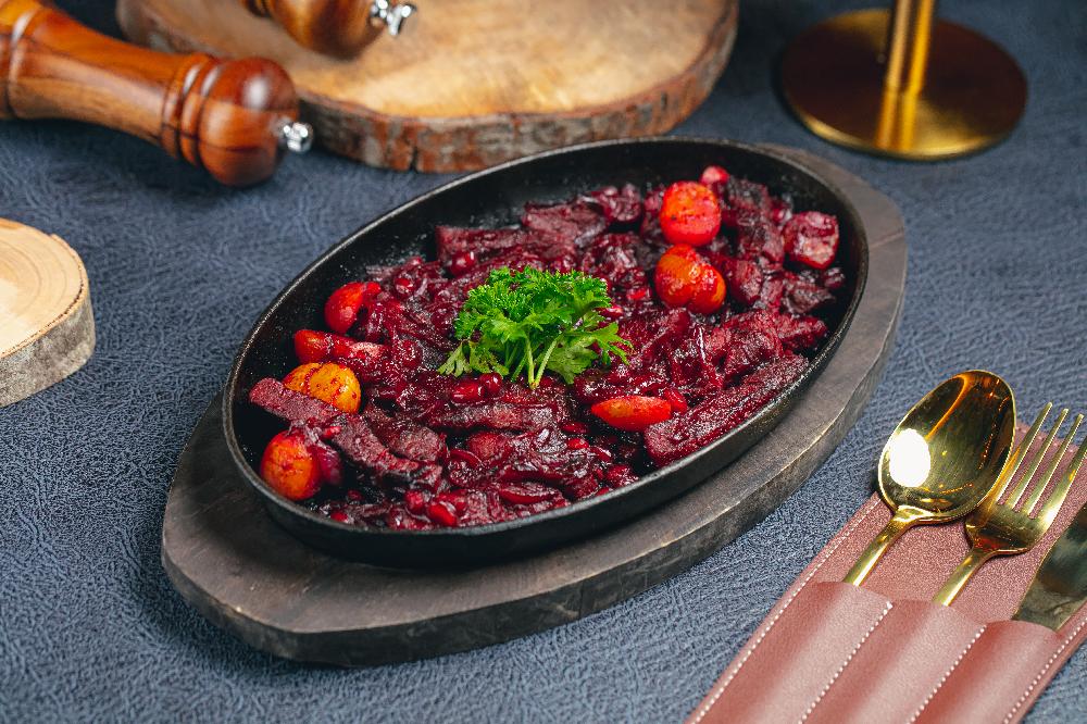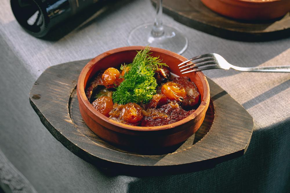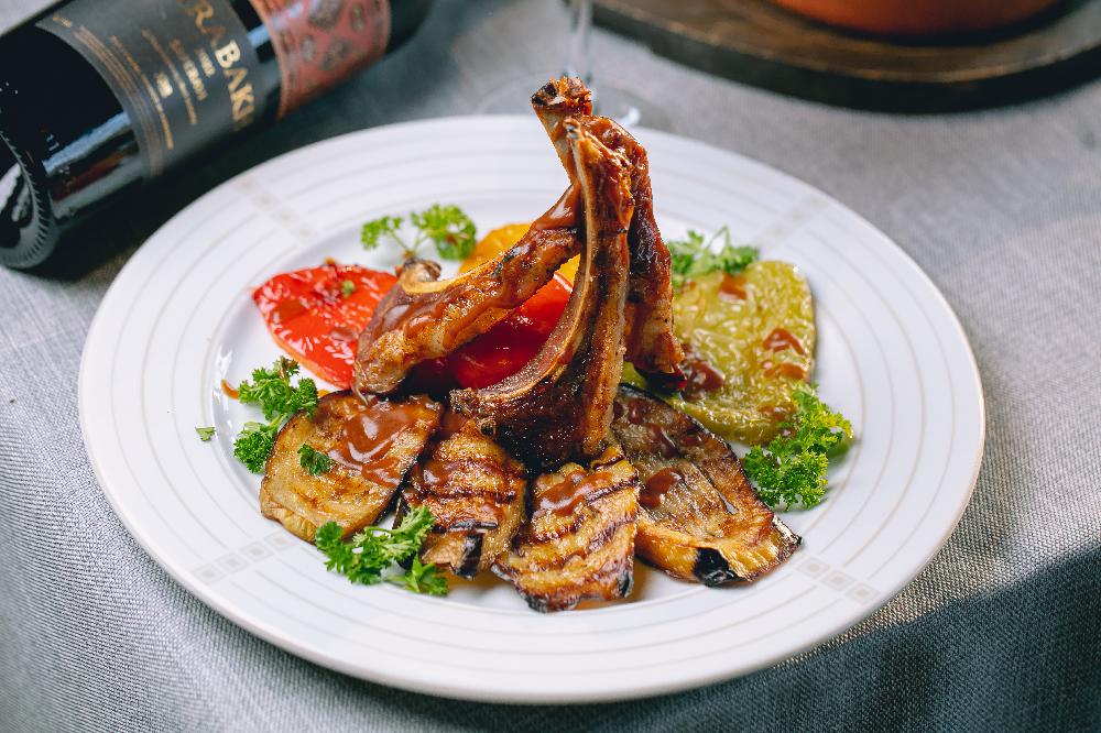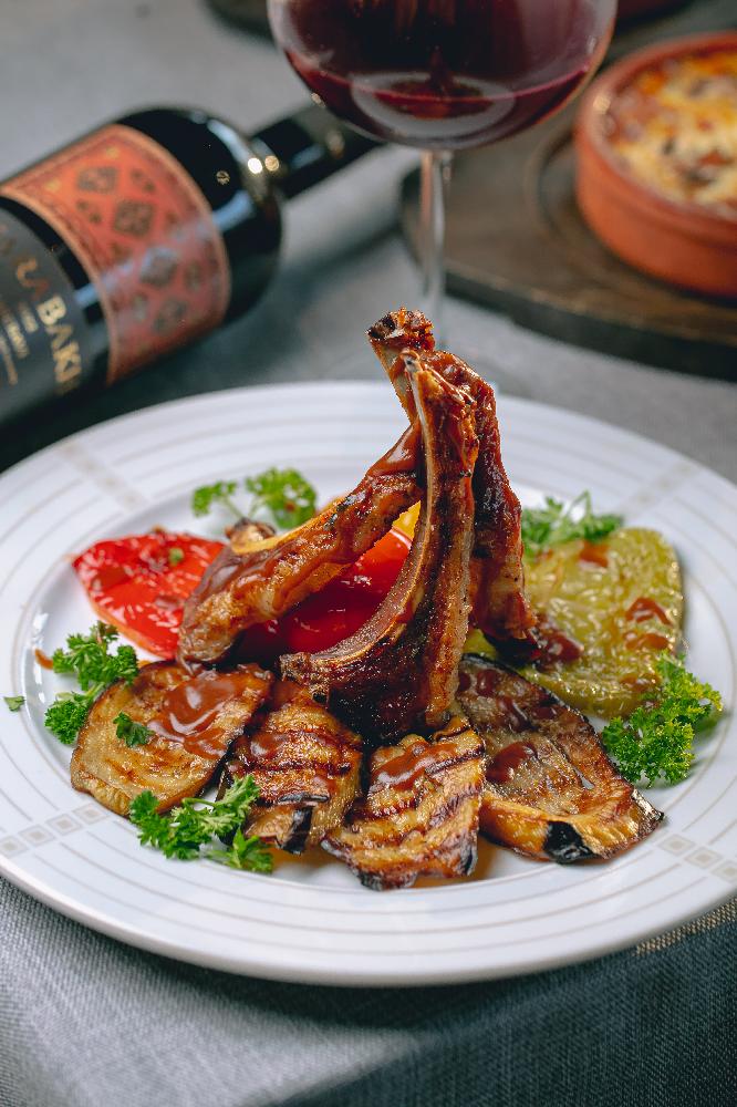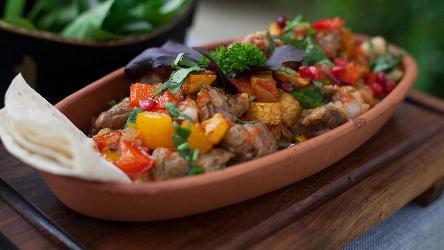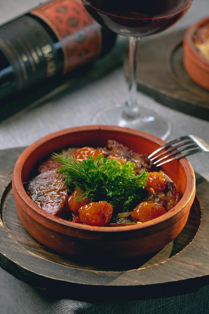 Quzu əti, rəngli bibər, pomidor, badımcan, kök, demiglass, duz, istiot, kərə yağı, göyərti