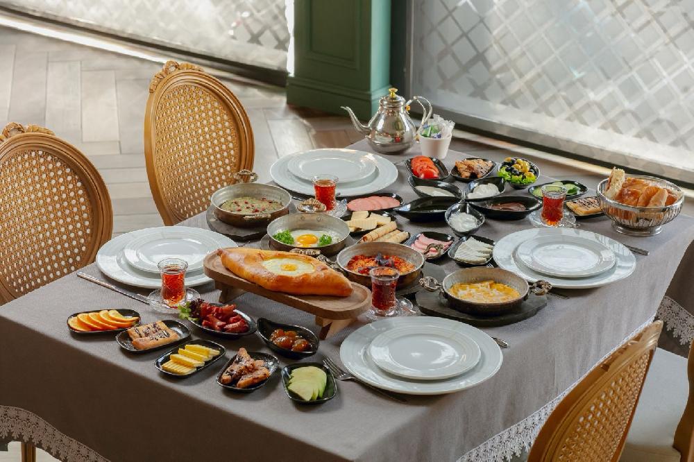 Acaruli xaçapuri, pomidor yumurta, siqara börək, kükü, qlazok, qızardılmış sosis, pendirli omlet, kolbasa doktorskaya, kolbasa servelat, yumurtalı tost, zeytun qara, zeytun yaşıl, mürəbbə əncir, pomidor, xiyar, pendir ağ, pendir holland, xama, qaymaq, qatılaşdırılmış süd, bal, təndir çörək, çay