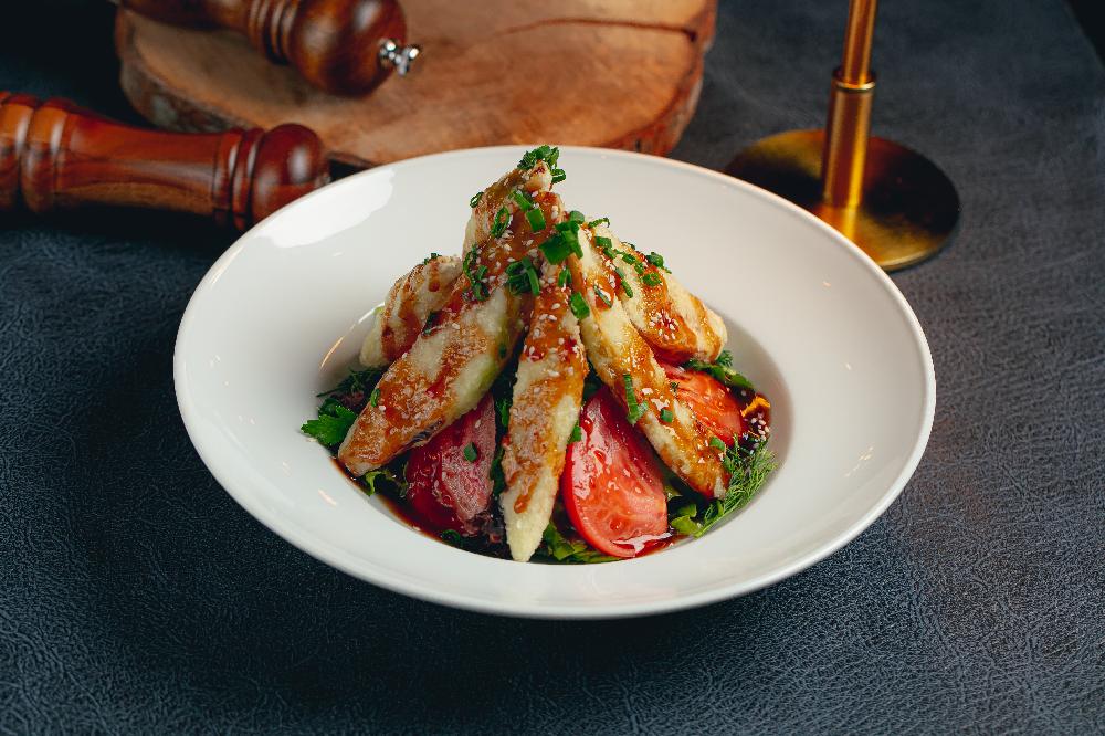 Mal əti, suluguni pendiri, mayonez, pomidor, yumurta.