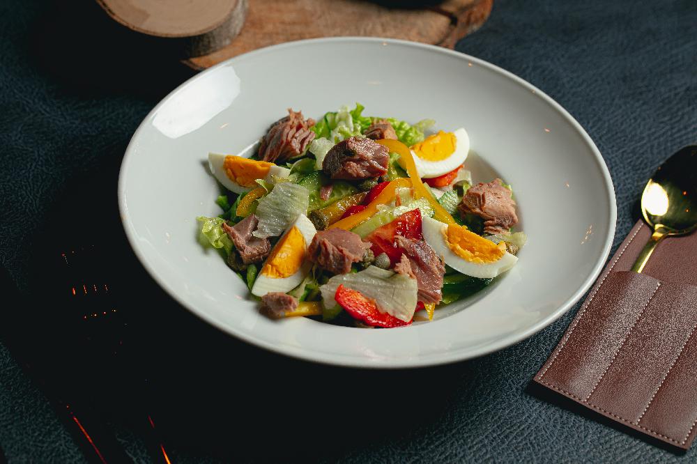 Tuna balığı, kahı, aysberq, pomidor, rəngli bibər, xiyar; cappers, yumurta, göyərti, zeytun yağı
