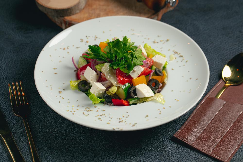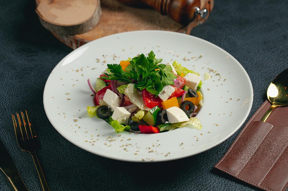 Xiyar, pomidor, rəngli bibər, zeytun yağı, ağ pendir, zeytun qara, soğan qırmızı, oreqano