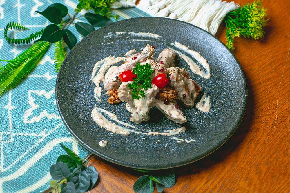 Toyuq, qoz, mayonez, sarımsaq, badımcan