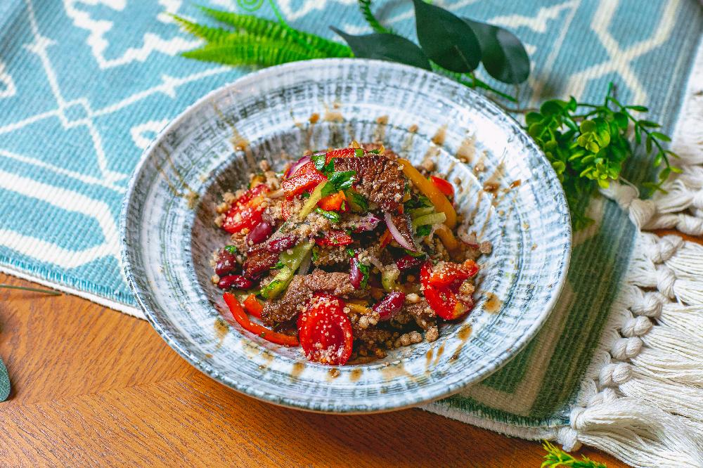 Xiyar raboçiy Melit/ Yelpənək, bibər rəngli, lobya qırmızı konserv, qoz ucuz, göyərti, can əti, soğan qırmızı, narşərab, sous soya, yağ zeytun, yağ bitki, pomidor çerri, duz, istiot qara üyüdülmüş.