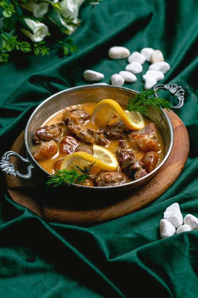 Mal əti/dana əti, soğan ağ, kartof iri, sarımsaq, duz, gürcü ədviyyatları, yağ bitki, zirinc, bibər rəngli, göyərti
