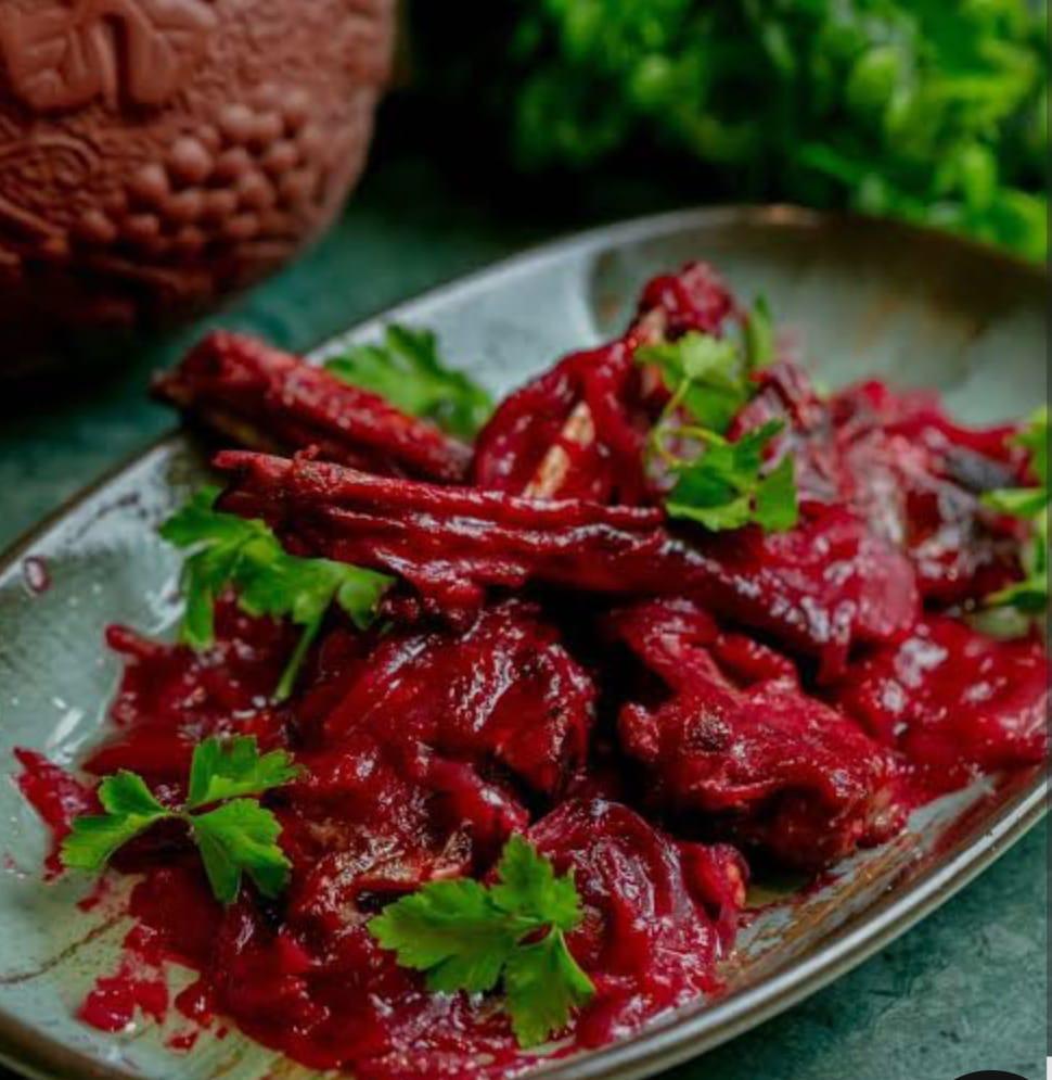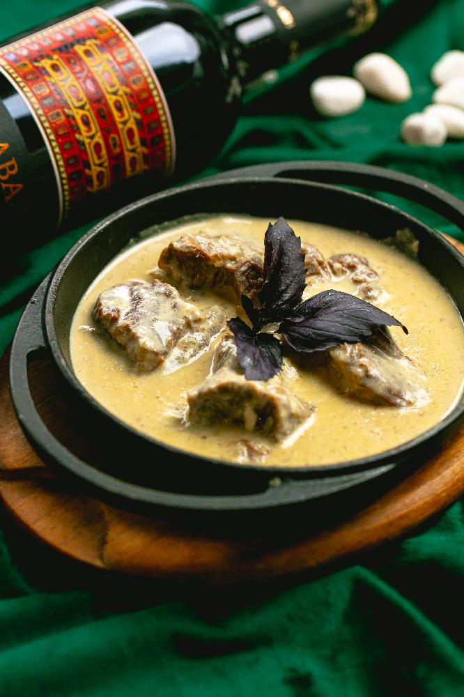 Mal əti/dana əti, soğan ağ, pomidor, sarımsaq, Wine Xan göy-göl, gürcü ədviyyatları, istiot qara üyüdülmüş, duz, bibər rəngli, yağ bitki, sarımsaq, göyərti