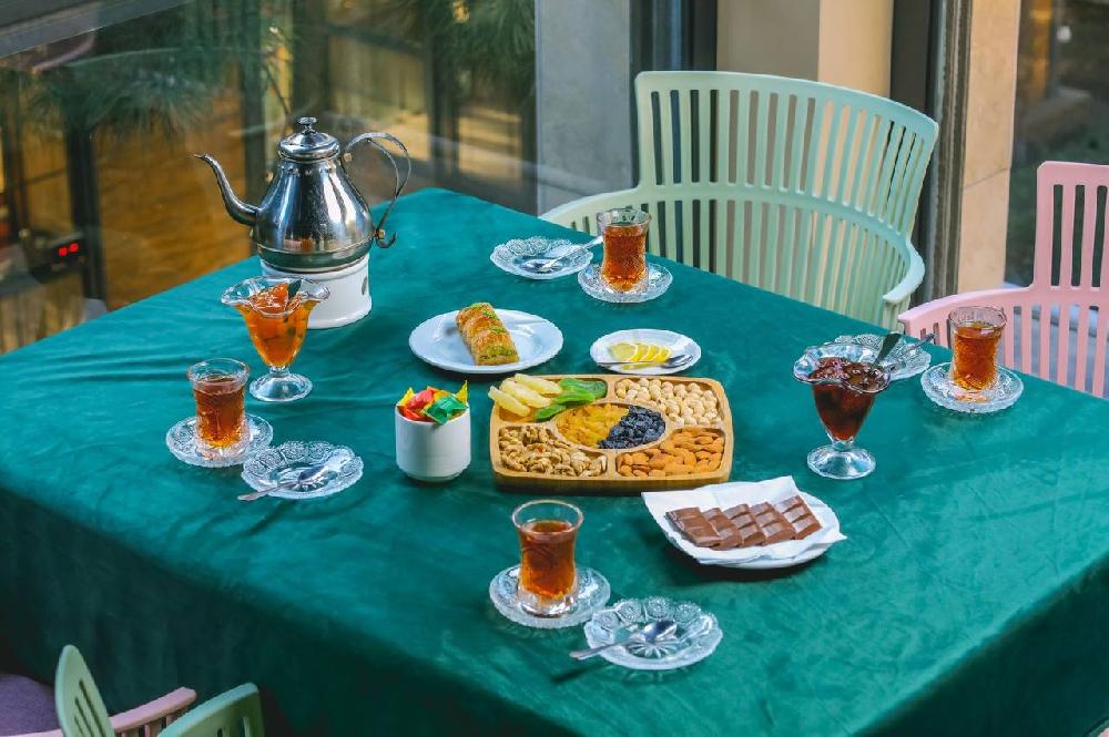 Plitka şokolad, merci şokolad, quru meyvələr ( Ananas, kivi, ağ kişmiş, qara kişmiş) noğul, türk paxlavası, qarışıq çərəz ( Qoz, badam, fındıq) seçim əsasında mürəbbə, çay
