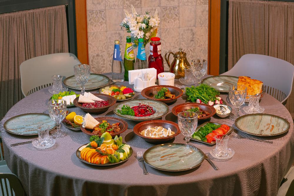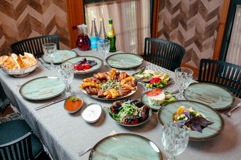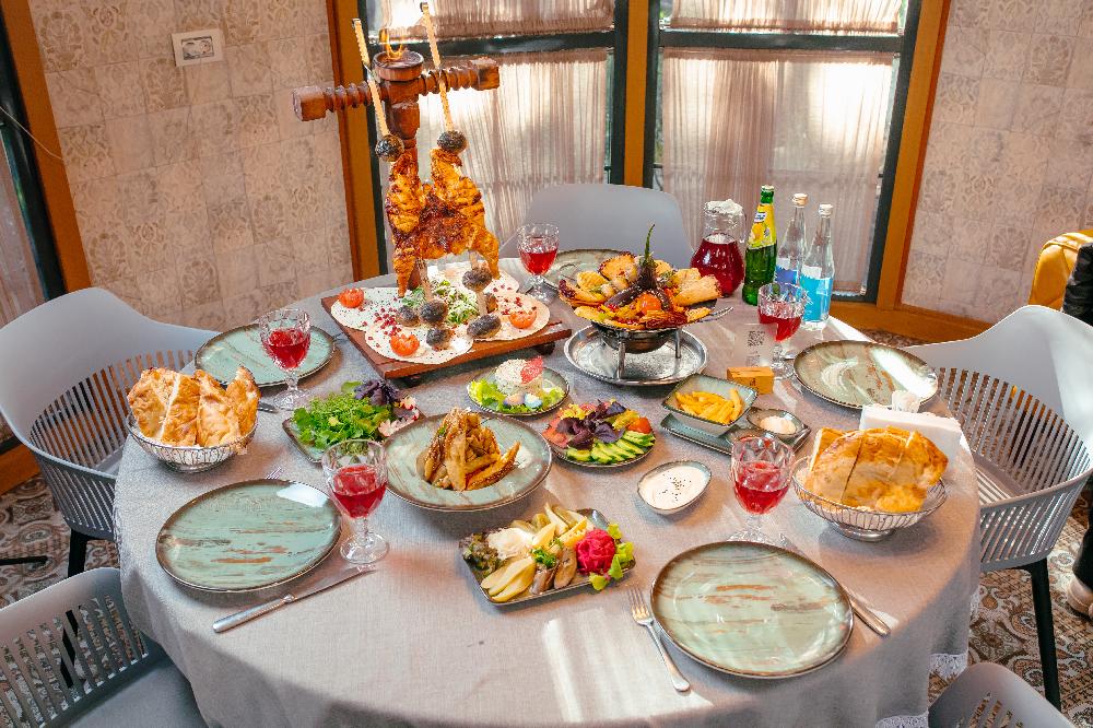 Oçaxuri mal əti, kupati, kokoti, çaşuşuli, gürcüsayağı təzə salat, lobya salatı, turşu assorti, qozlu badımcan, çörək , kompot