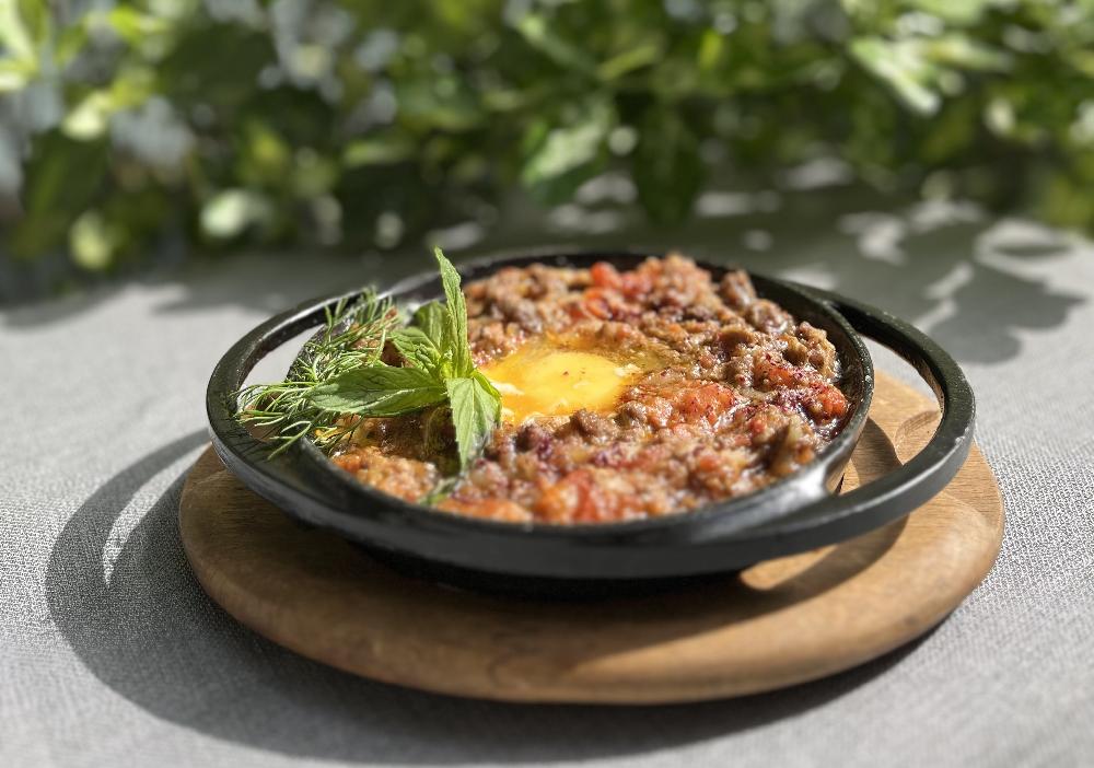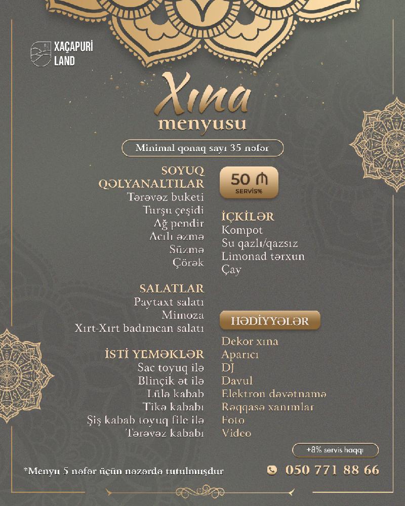 Mal ətindən tuşonka, qaymaqlı toyuq, vişnəli can əti, quzu çoban qovurma, quzu buğlama, ağ pendir, turşu assorti, süzmə, limon, pomidor, xiyar, göyərti assorti, albalı salatı, acika, çörək, kompot,limonad, su qazlı/qassız, meyvə assorti, çay