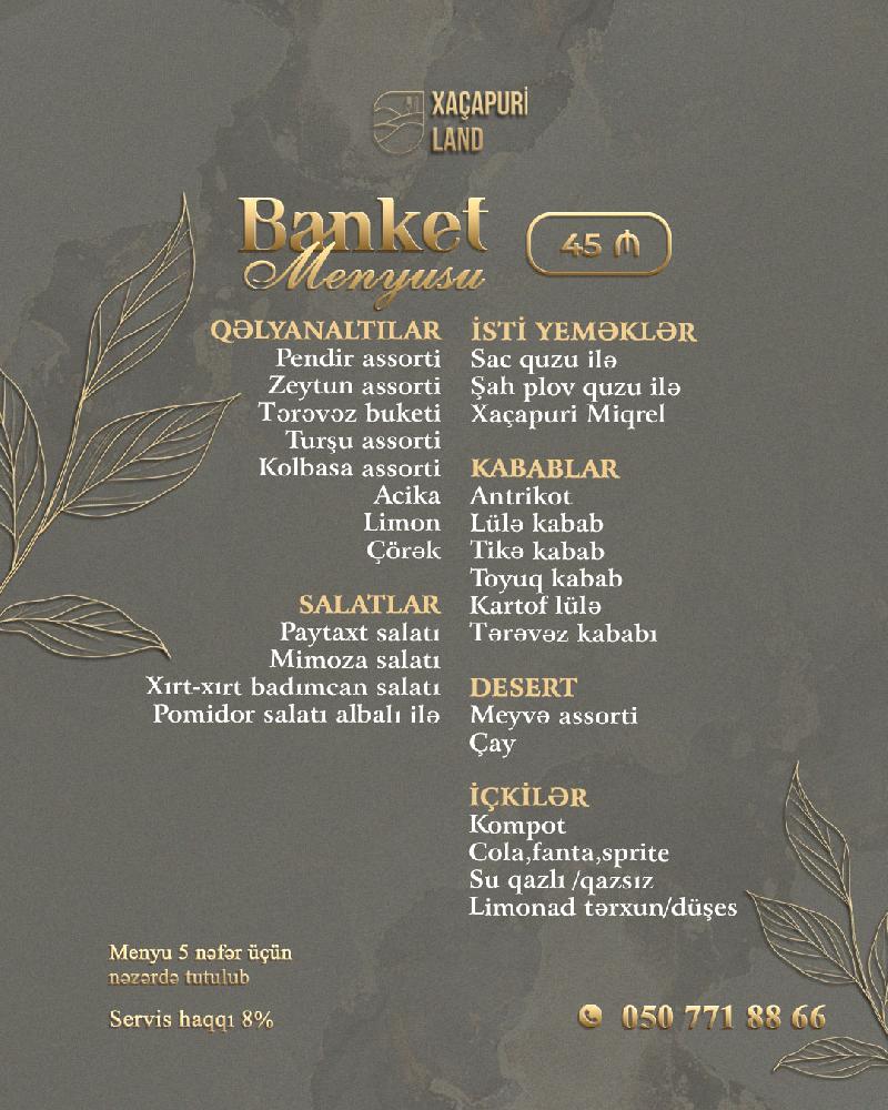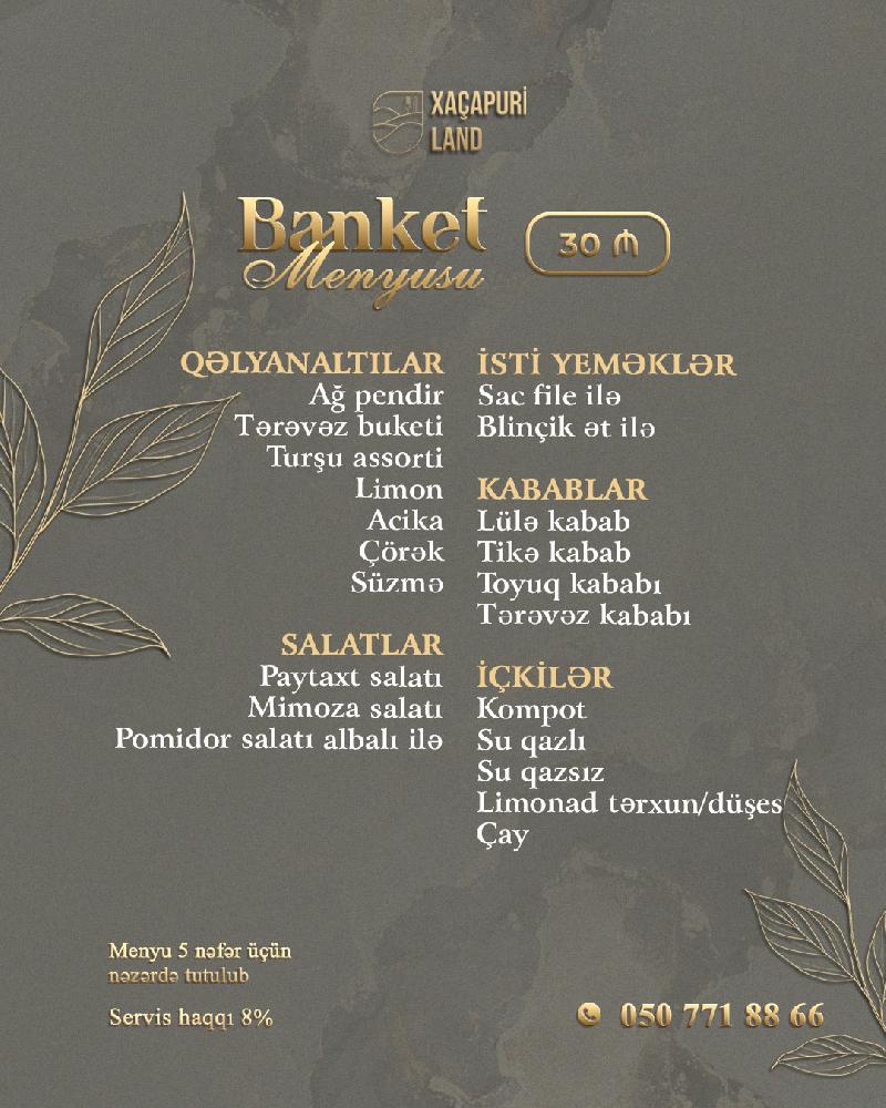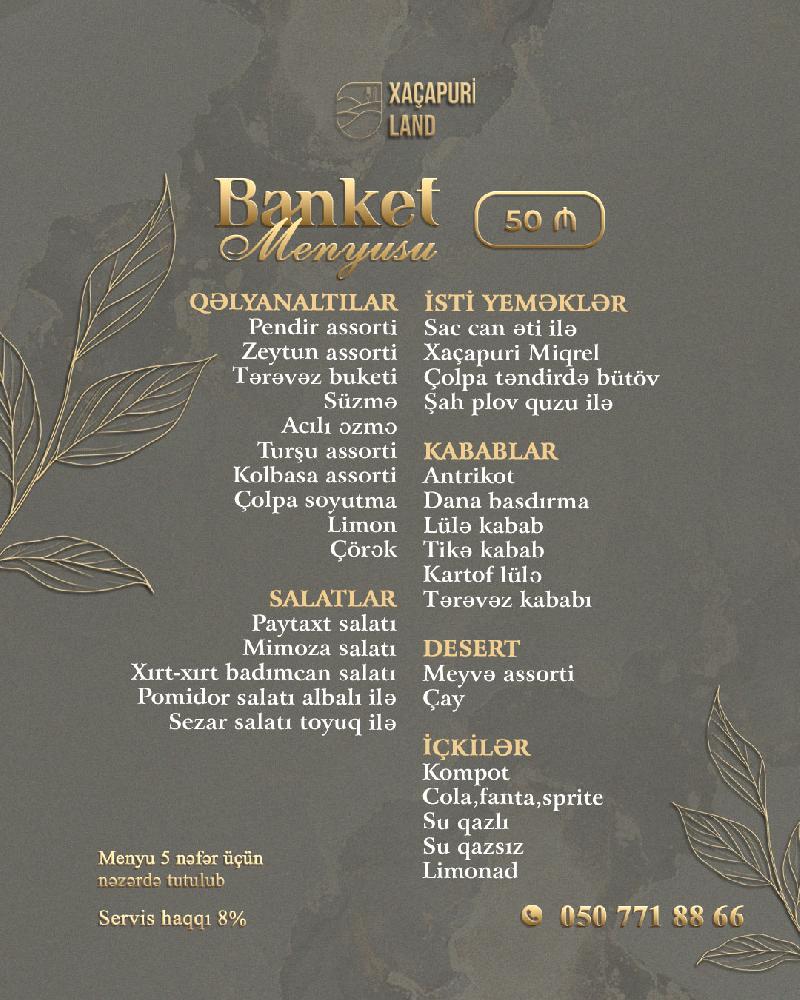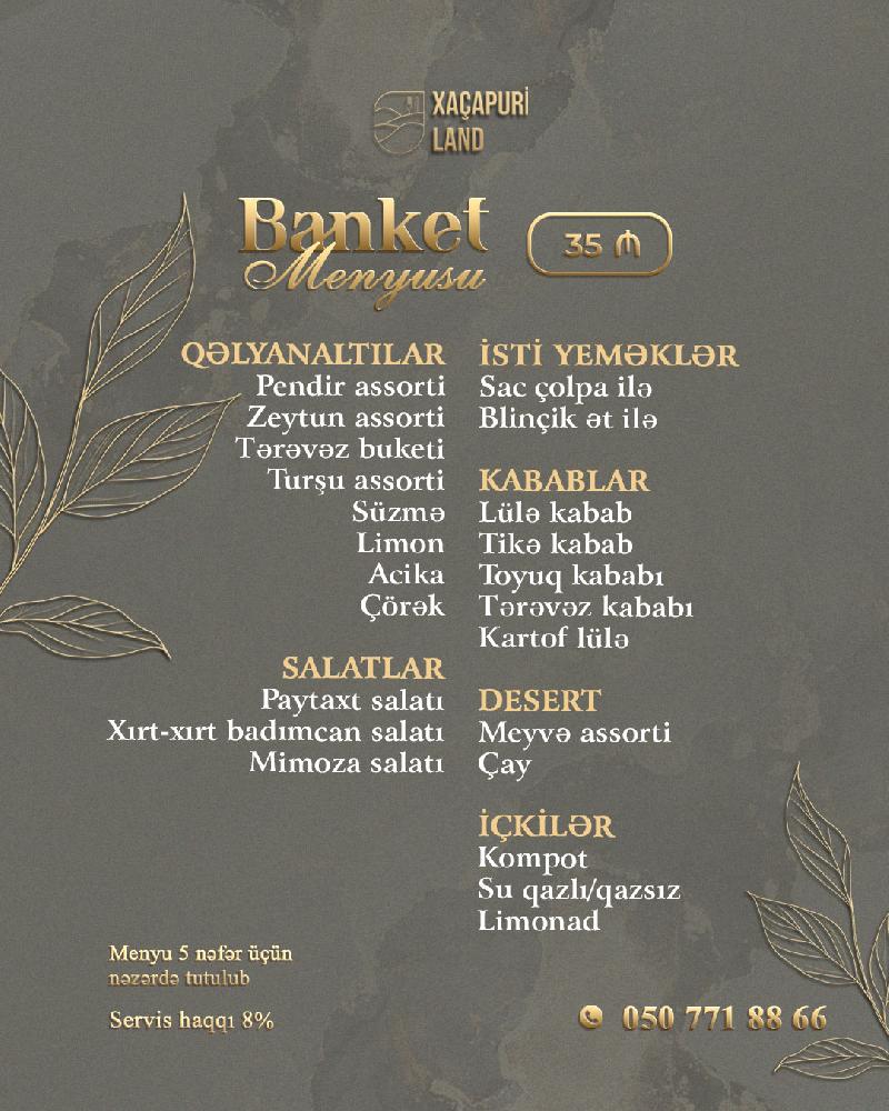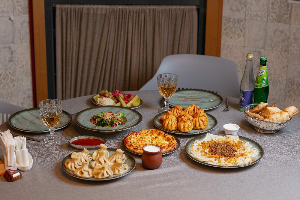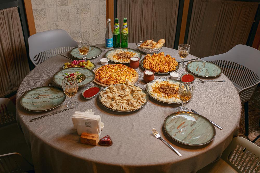Gürcü xəngəli 16, Gürcü xəngəli qızartma 16, Gürcüsayağı təzə salat, Yapraq 2, turşu çeşidi , acika, Qatıq küp, Lemonad Tərxun/Düşes 0.5L, Su qazlı qazsız, Miqrel Xaçapuri və ya İmeruli Xaçapuri