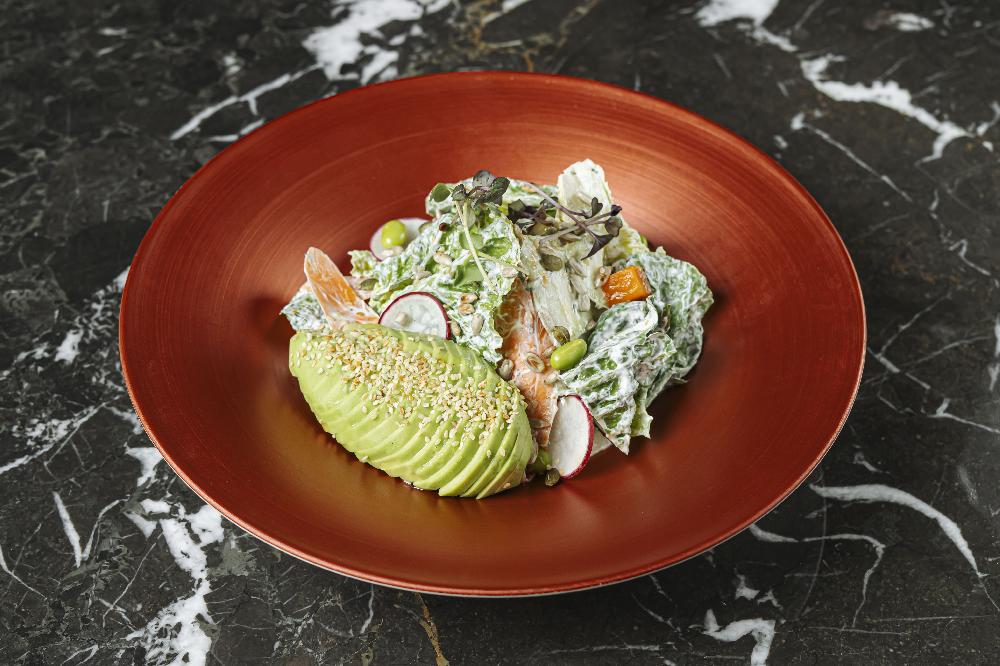 with avocado, fresh salad and seven seed cracker