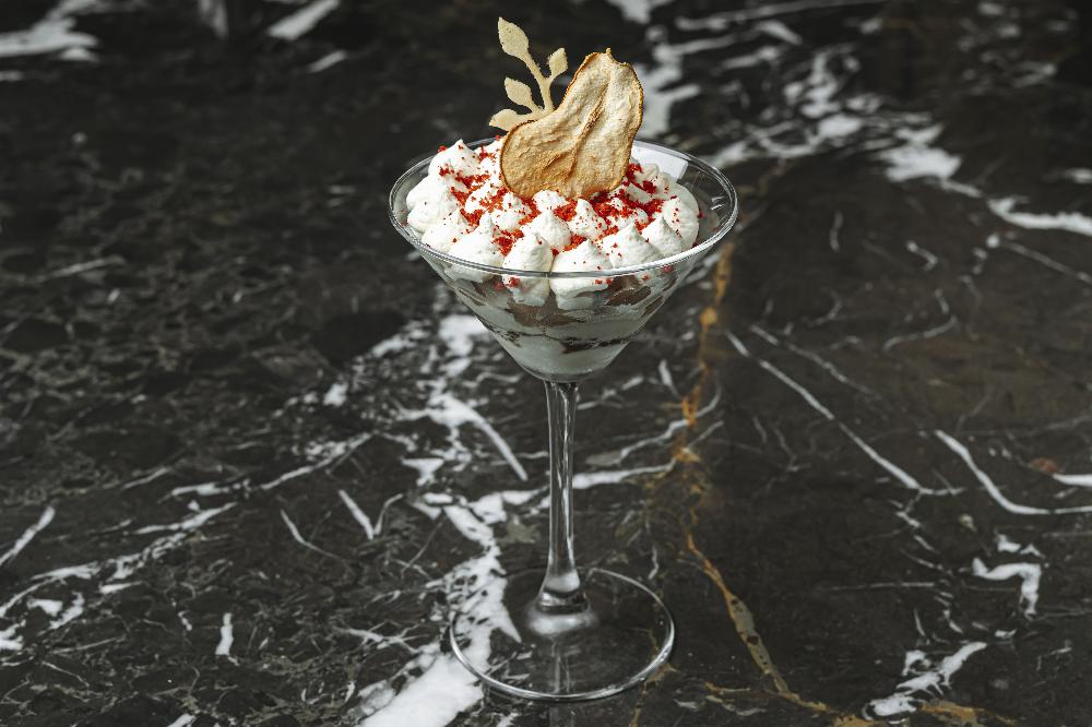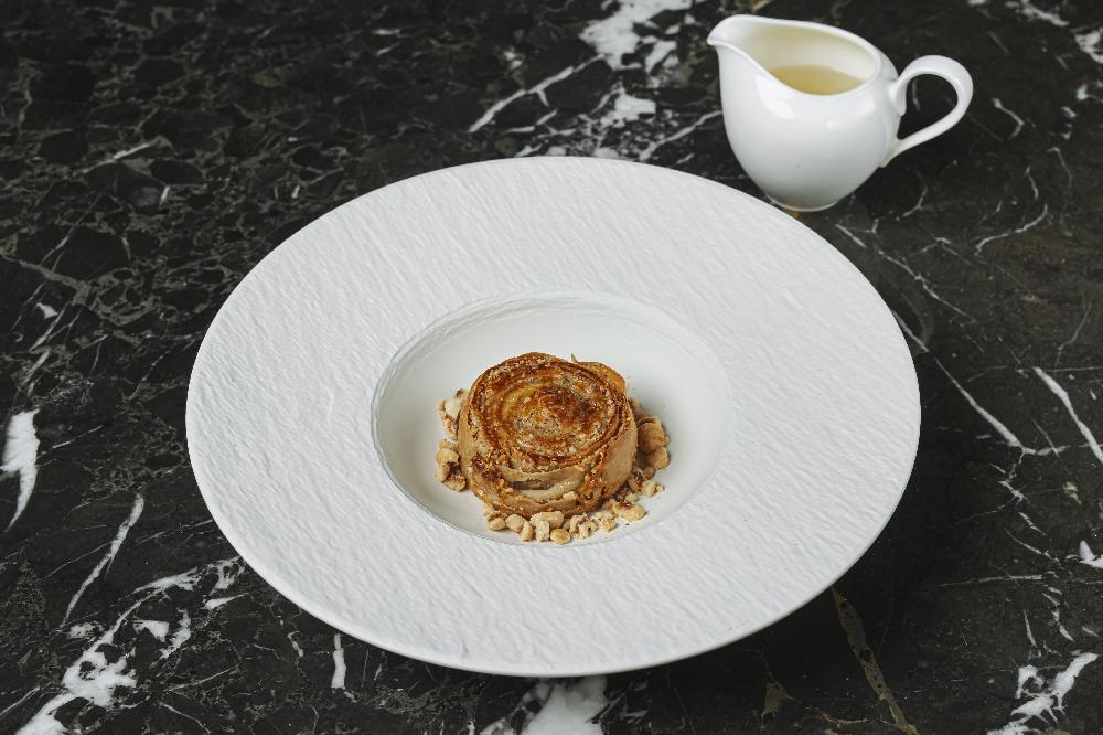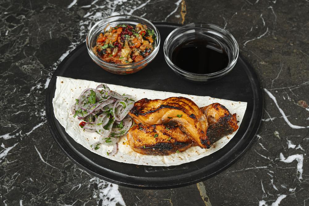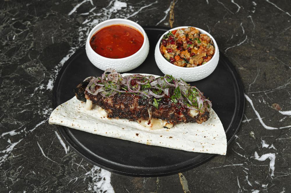 Tortilla Egg roll stuffed with Baku tomato, avocado and creamy red caviar sauce