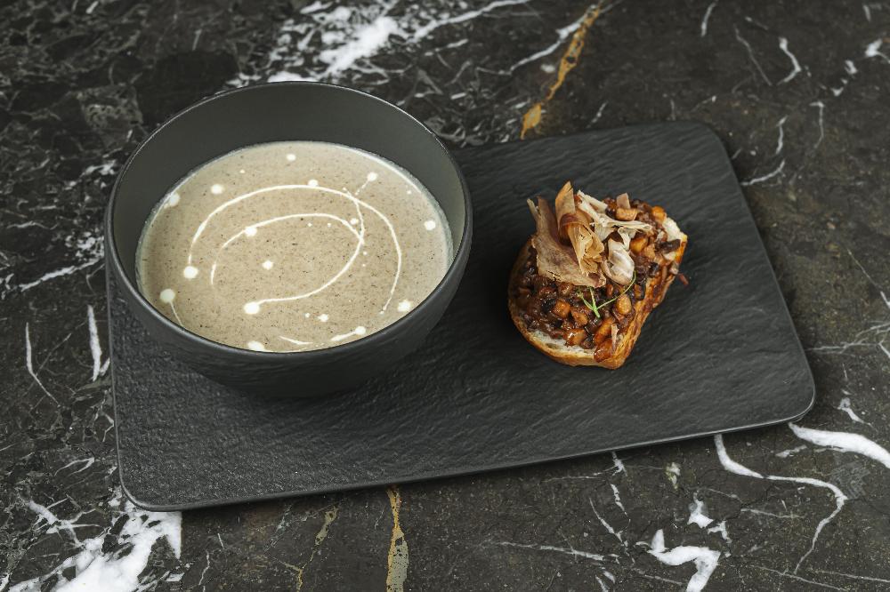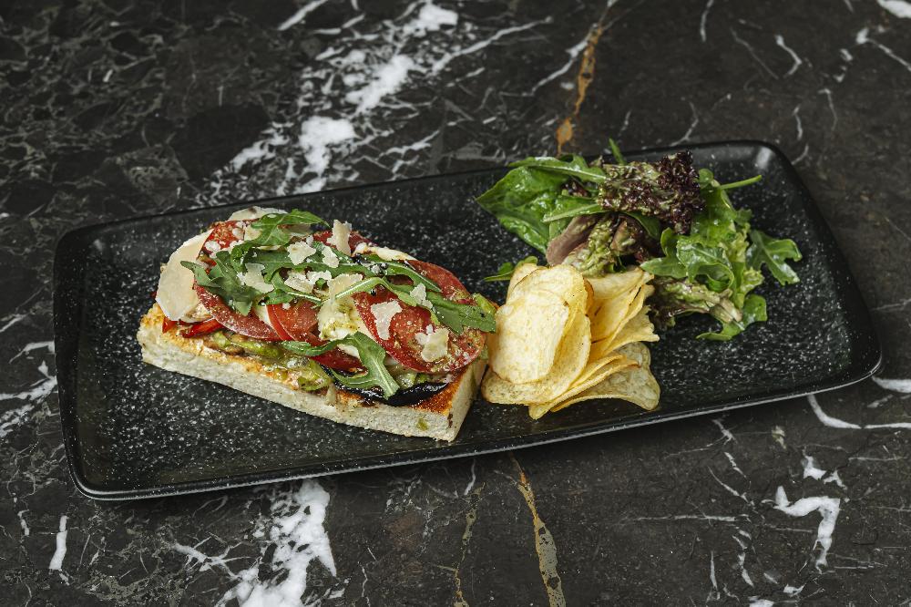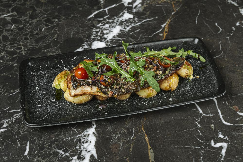 with balsamic reduction, almond pesto, arugula leaves and focaccia croutons