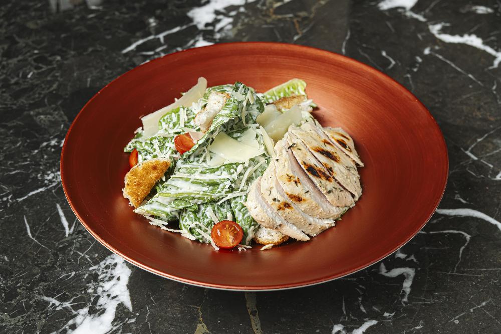 Caesar salad with Romaine lettuce, special dressing, anchovice croutons, shaved parmesan, grilled chicken