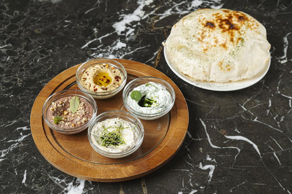 Green olive Hummus, Red Bean ezme, Greek yoghurt and cucumber, Mutabal, served with homemade bread
