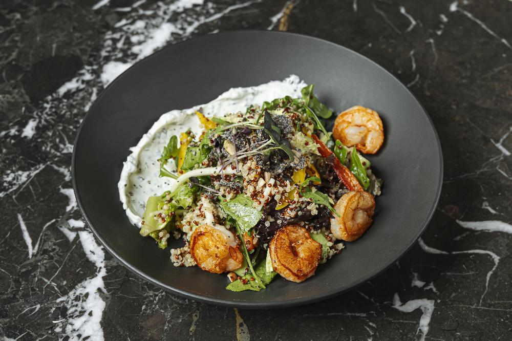 with vegetables, prawns and fresh salad mix