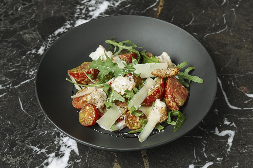 with stracciatella cheese and marinated tomato, asian style dressing