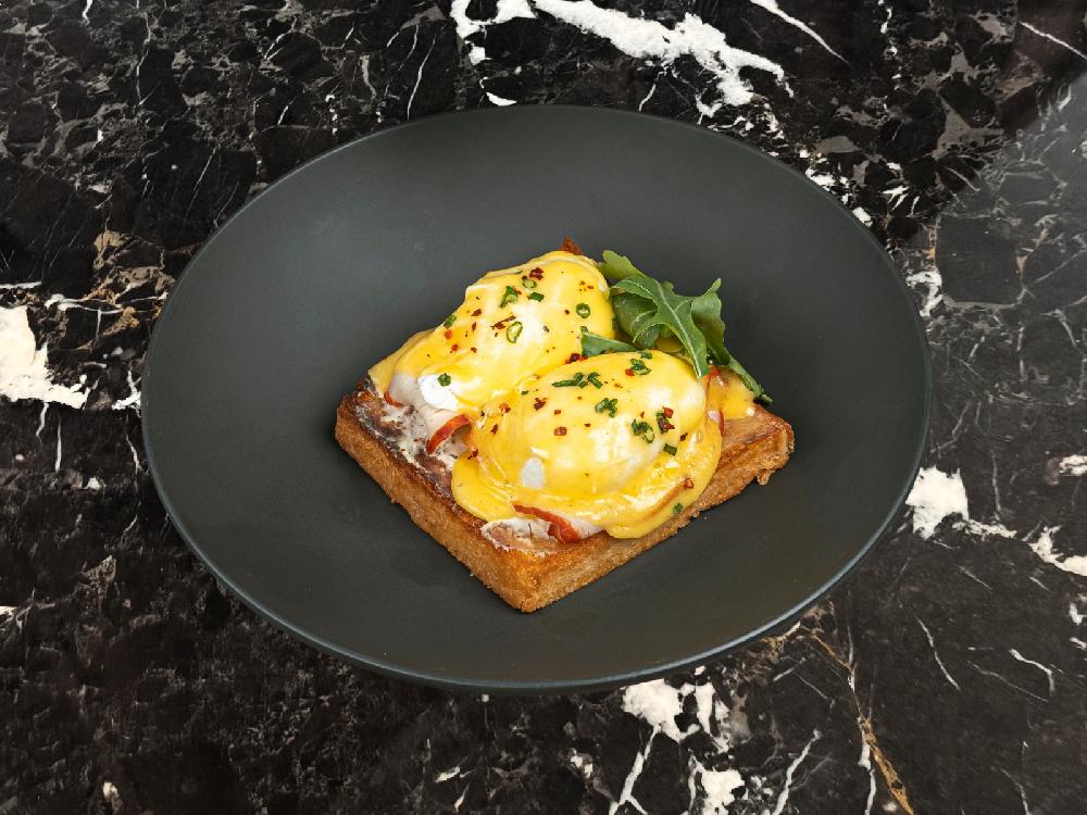 Egg benedict on brioche bread with citrus cured salmon and avocado guacamole