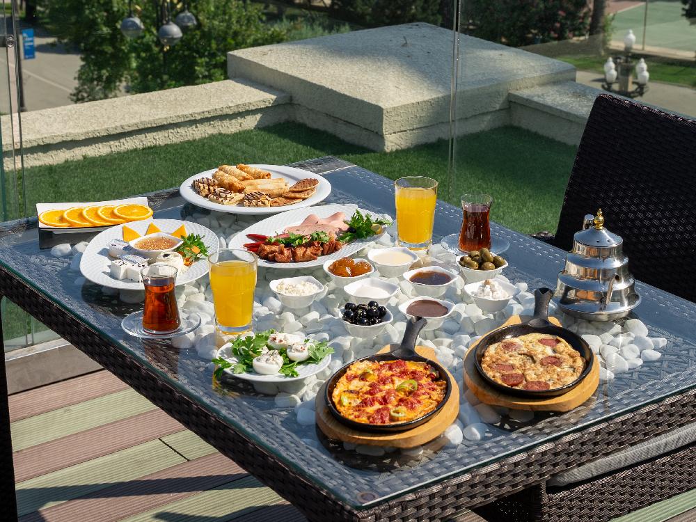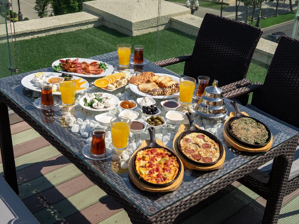 Kükü, pomidor yumurta, omlet, şokolad yağı, bal, qaymaq, kərə yağı, zeytun, holland pendiri, ağ pendir, pomidor, xiyar, kəsmik, şirin kəsmik, mürəbbə, kolbasa, qızardılmış sosiska, siqara börək, blinçik, çörək, meyvə şirəsi(4 stəkan), çay