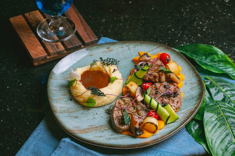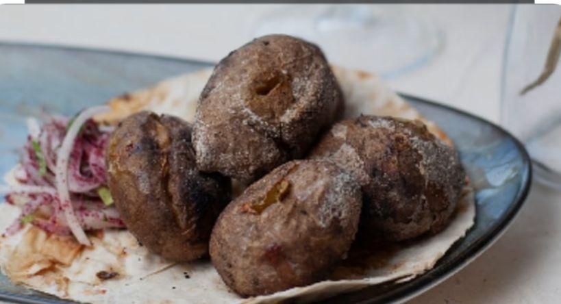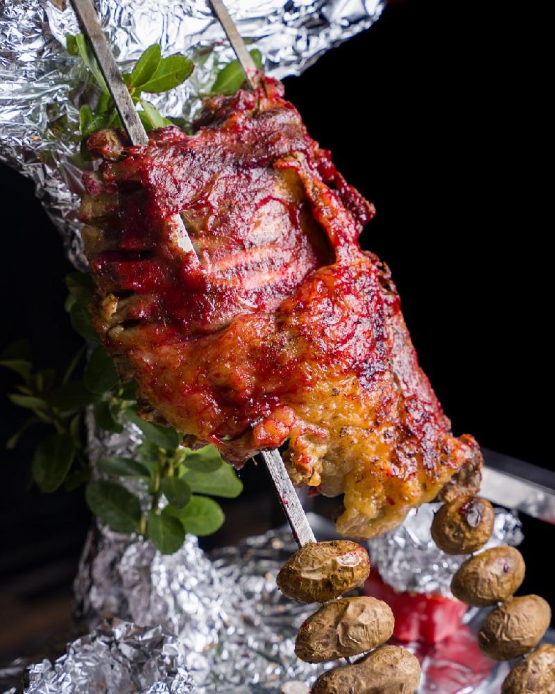 Quzu əti, soğan, göbələk, pomidor, acı bibər, rəngli bibər, badımcan, kartof, lavaş.