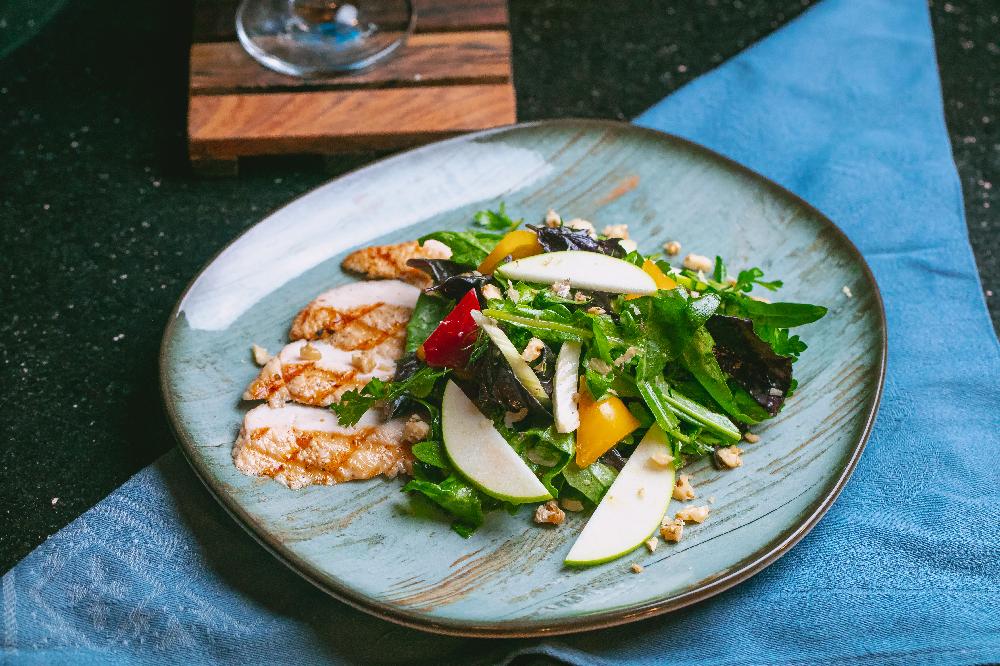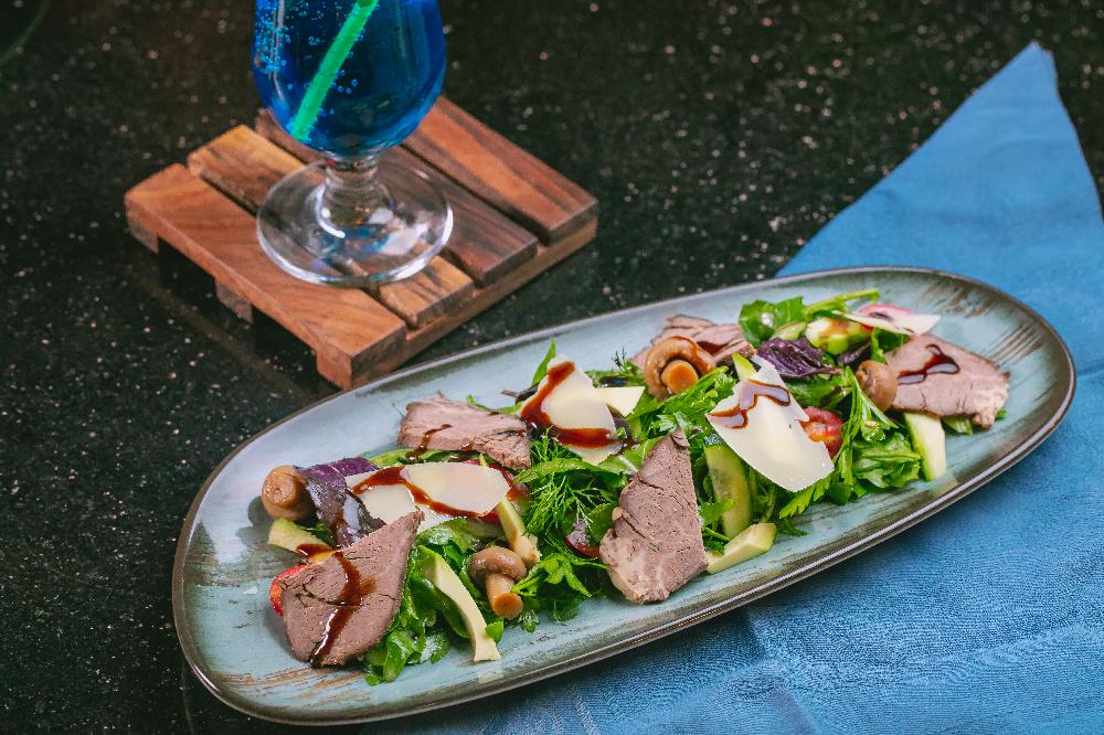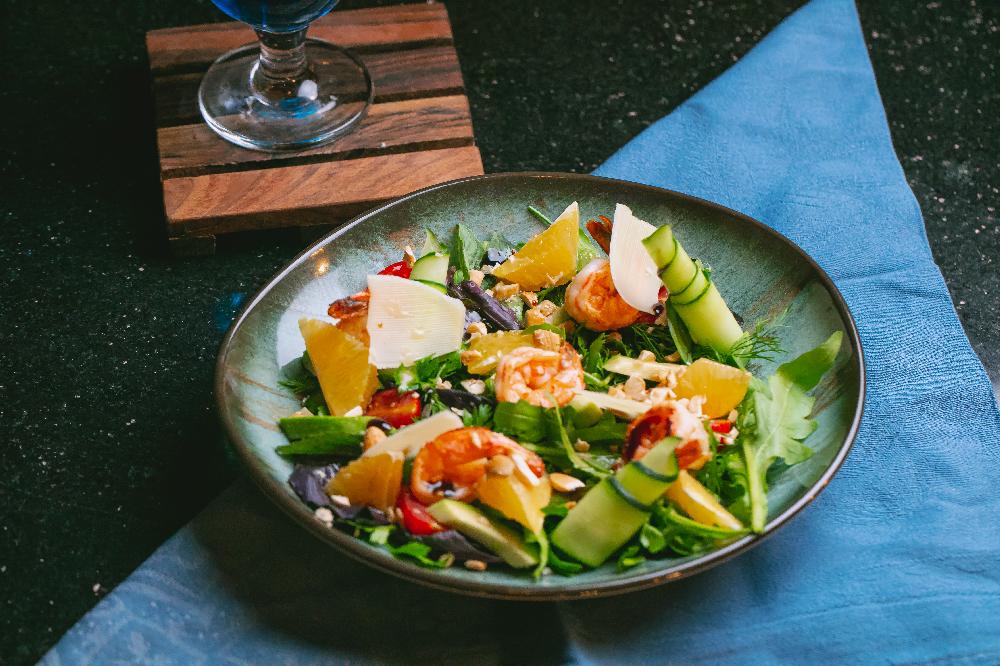 Kahı yaşıl,göyərti,rukola,krevet,pomidor çerri,avokado,sous balzamik krem,xiyar,qoz,pendir parmezan,duz,portağal,hind qozu,keşyu,yassay sous